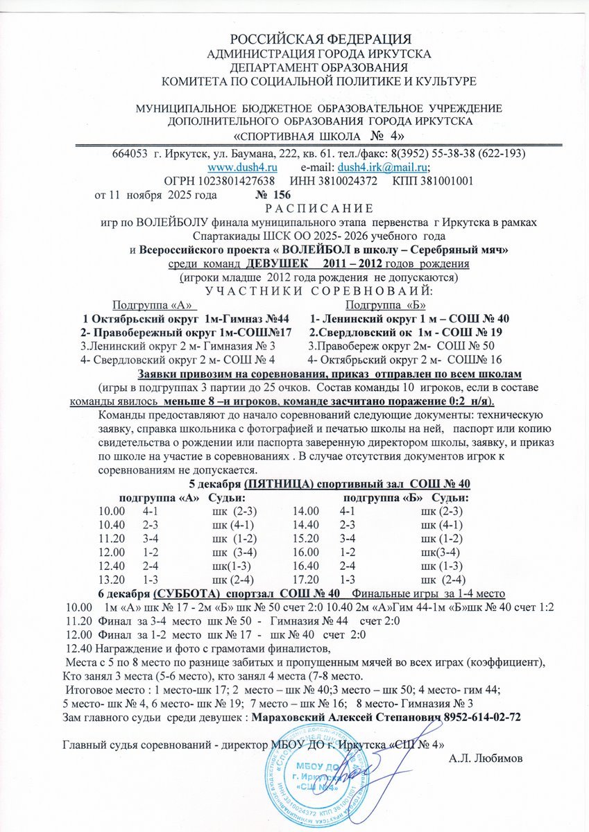 Финальные соревнования по волейболу среди девушек 2011-2012 годов рождения прошли в г. Иркутске 5-6 декабря 2025 на базе спортивного зала МБОУ г. Иркутска СОШ № 40 в рамках Всероссийского проекта «Волейбол в школу – Серебряный мяч»