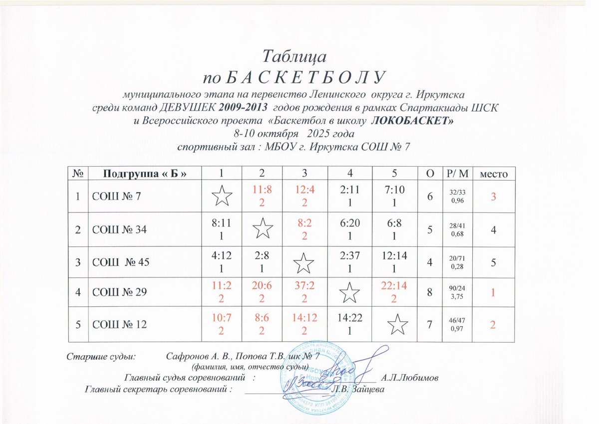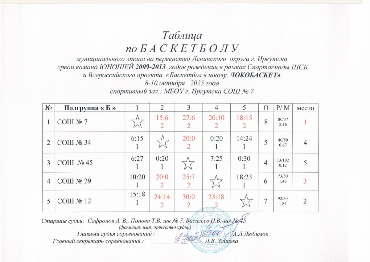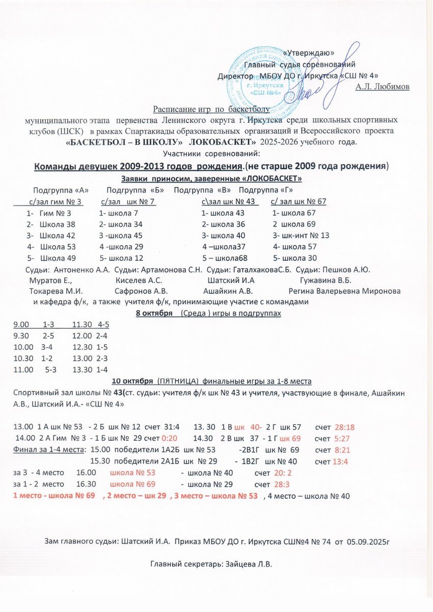 В Ленинском округе города Иркутска в период с 8 по10 октября 2025 года проводились соревнования по БАСКЕТБОЛУ среди школьных спортивных клубов в рамках Спартакиады г. Иркутска 2025-2026 учебного года. В соревнованиях принимали участие сборные команды школ (юноши и девушки 2009 -2013 годов рождения). Игры проводились на базах спортивных залов школ № 67,7,Гимназия № 3,43