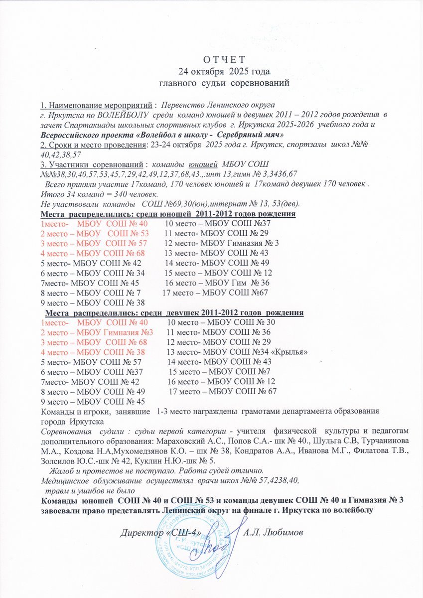 В Ленинском округе города Иркутска в период с 22 по 23 октября 2025 года проводились соревнования по волейболу среди школьных спортивных клубов в рамках Спартакиады г. Иркутска 2025-2026 учебного года и Всероссийского проекта «Волейбол в школу-«Серебряный мяч» В соревнованиях принимали участие сборные команды школ (юноши и девушки 2011 -2012 годов рождения). Игры по волейболу проводились на базах спортивных залов школ № 42,38,57, 40. Всего приняли участие 17 команд юношей = 170 человек. Не приняла участие в Спартакиаде – команда СОШ № 69,интернат № 13, СОШ 30(юн) и СОШ№ 53 (дев), и 17 команд девушек = 170 человек. Итого 34 команд = 340 человек