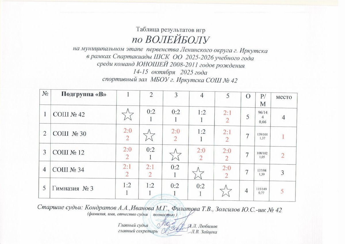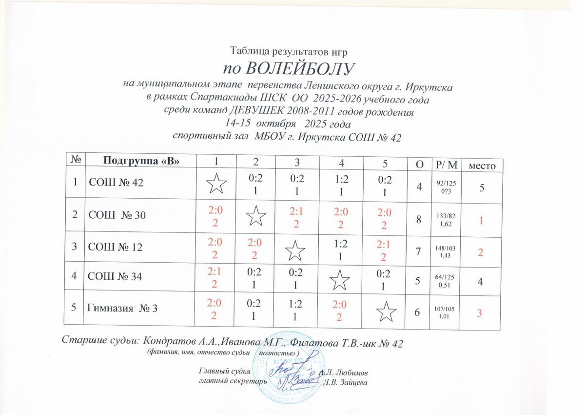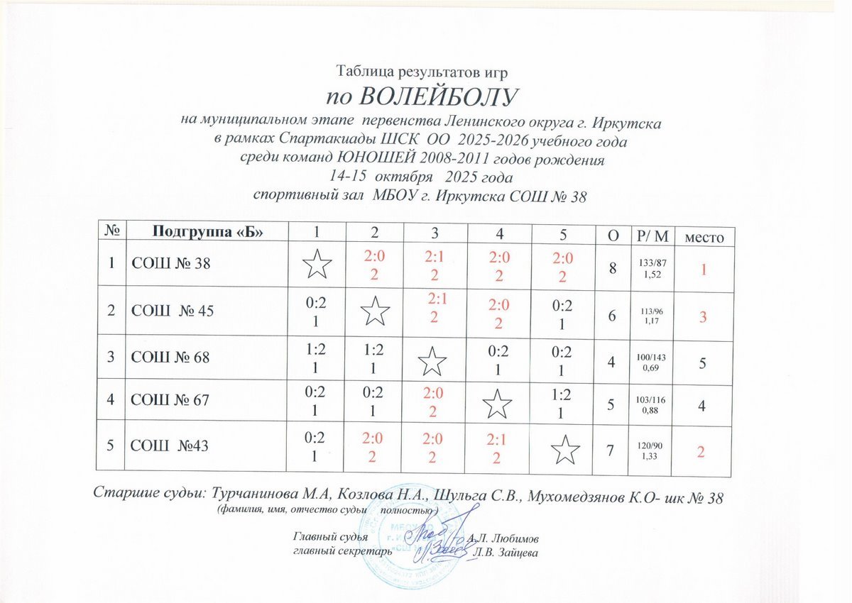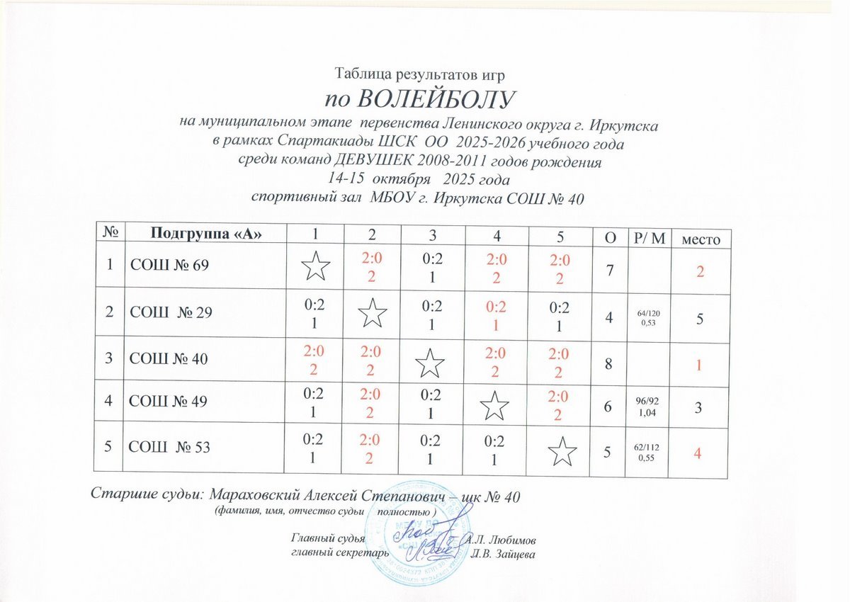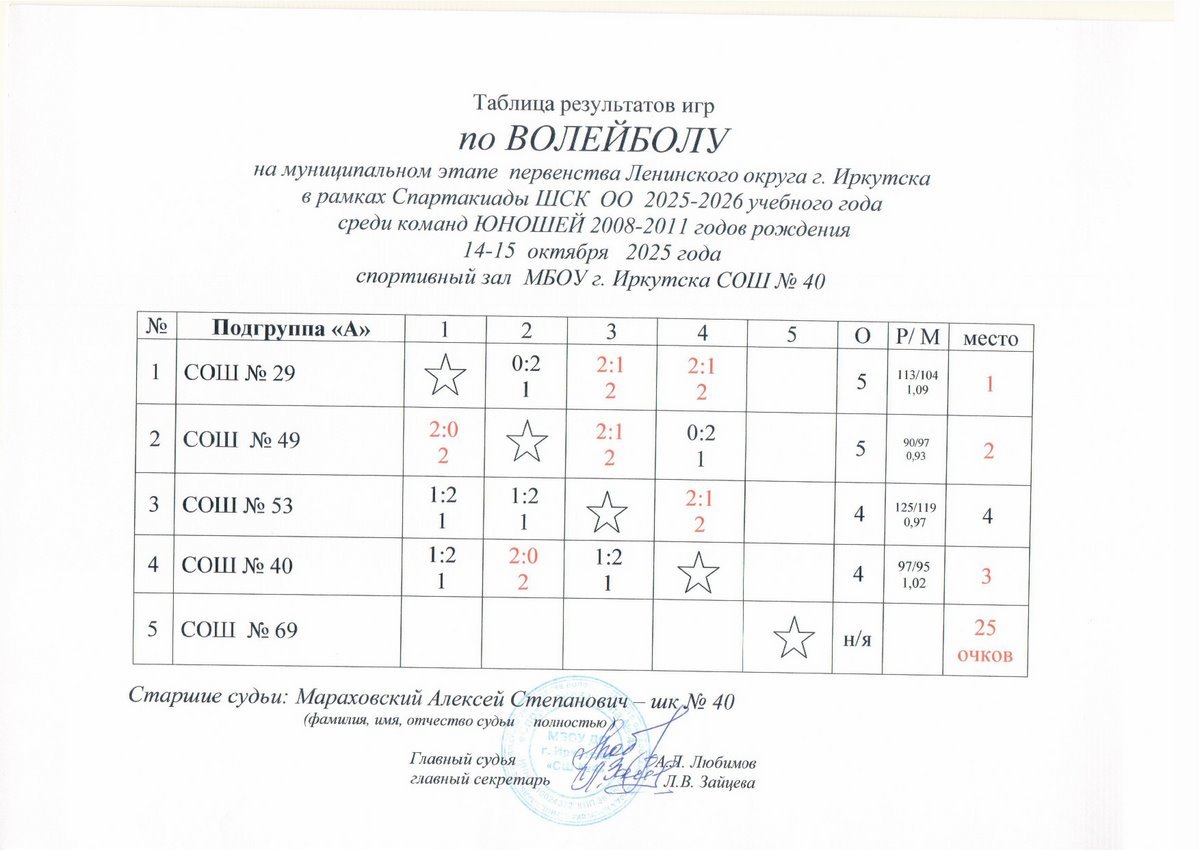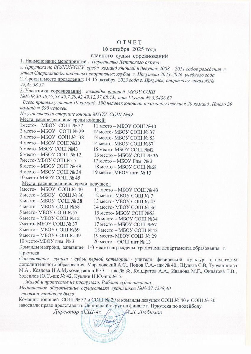 В Ленинском округе города Иркутска в период с 14 по 15 октября 2025 года проводились соревнования по волейболу среди школьных спортивных клубов в рамках Спартакиады г. Иркутска 2025-2026 учебного года. В соревнованиях принимали участие сборные команды школ (юноши и девушки 2008 -2011 годов рождения). Игры по волейболу проводились на базах спортивных залов школ № 42,38,57, 40. Всего приняли участие 19 команд юношей = 190 человек. Не приняла участие в Спартакиаде – команда юношей МАОУ СОШ № 69 (и.о. директора Кузнецова И.В.) и 20 команд девушек = 200 человек.Итого 39 команд = 390 человек