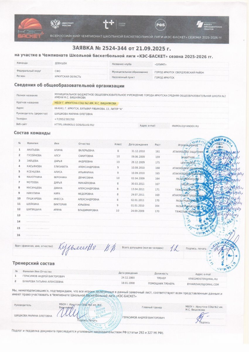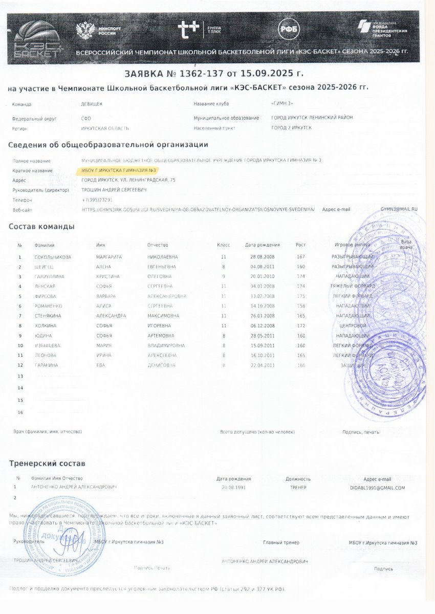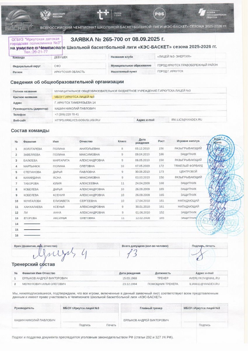 В городе Иркутска в период с 10 по 12 ноября 2025 года проводились соревнования по баскетболу среди школьных спортивных клубов в рамках Спартакиады г. Иркутска 2025-2026 учебного года и Всероссийского проекта «Баскетбол в школу – ШБЛ КЭС-БАСКЕТ» ДИВИЗИОН ЦЕНТР».
