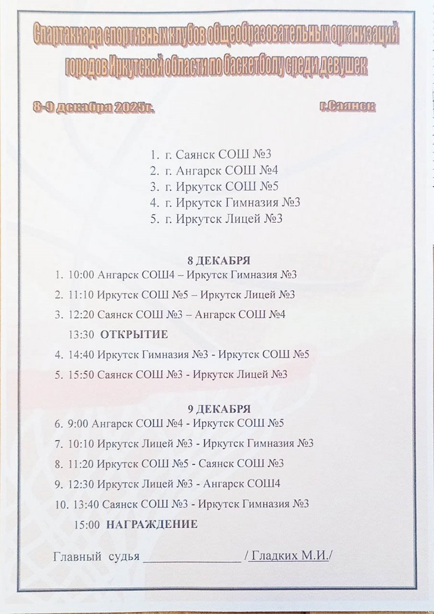 В период с 08 по 12 декабря 2025 года в городе Саянске проводились соревнования по баскетболу – « Спартакиада школьных спортивных клубов ОО Иркутской области на 2025-2026 учебный год» среди команд юношей и девушек 2008-2011 годов рождения. Среди команд девушек участвовали 5 команд: