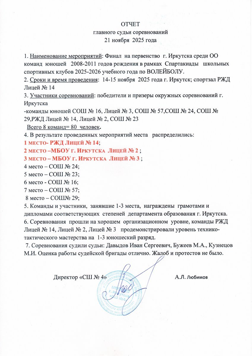 Команды, занявшие 1-3 места, награждены грамотами департамента образования г. Иркутска. Администрация «Спортивной школы № 4» благодарит участников финальных игр на первенство г. Иркутска по ВОЛЕЙБОЛУ и особенно отмечает подготовку команду по волейболу РЖД Лицея № 14.