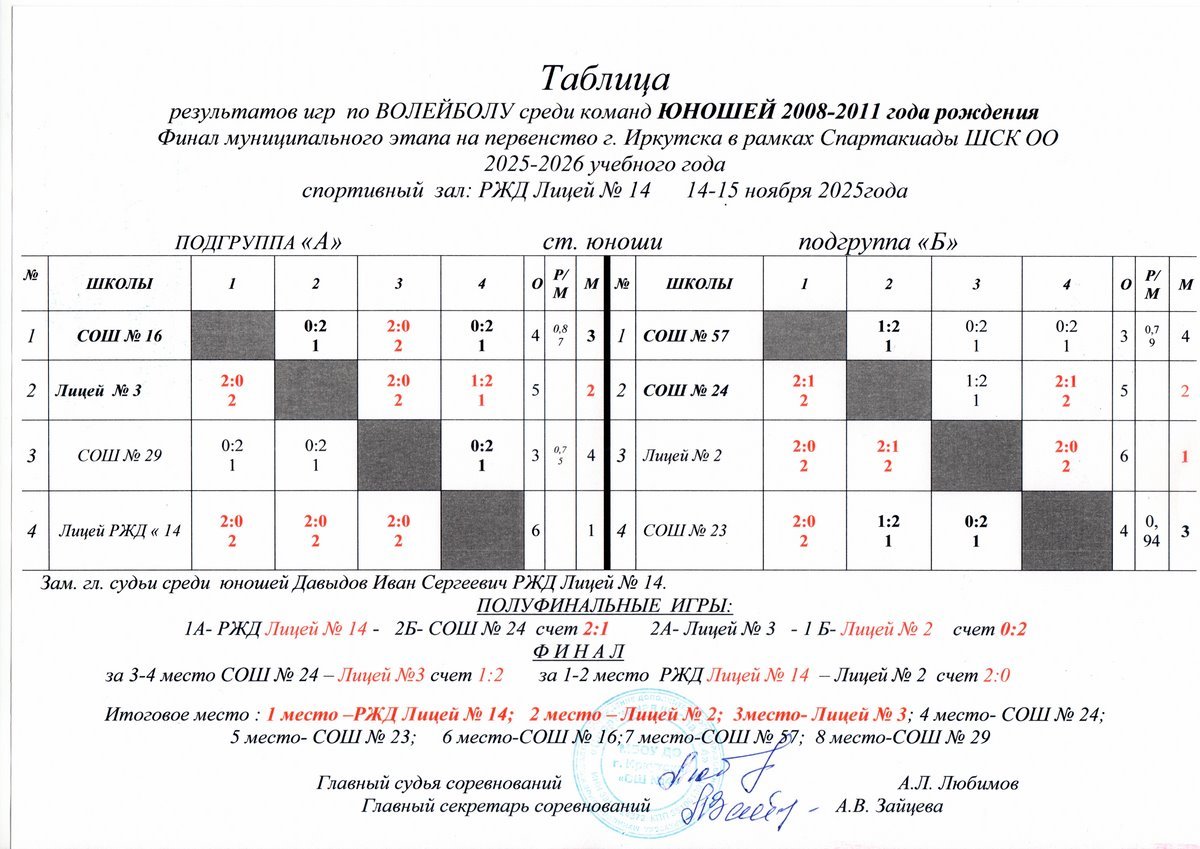 Финальные соревнования по волейболу среди старших юношей прошли в г. Иркутске 14-15 ноября 2025 на базе спортивного зала РЖД Лицей № 14