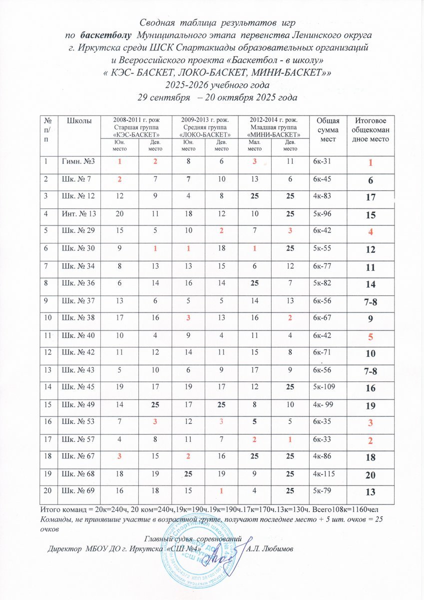 ИТОГИ соревнований по БАСКЕТБОЛУ среди школьных команд юношей и девушек Ленинского округа г. Иркутска в рамках Спартакиады ШСК ОО и Всероссийского проекта «Баскетбол в школу – «КЭС-БАСКЕТ», «ЛОКОБАСКЕТ» и «МИНИ-БАСКЕТ» 2025-2026 учебного года.